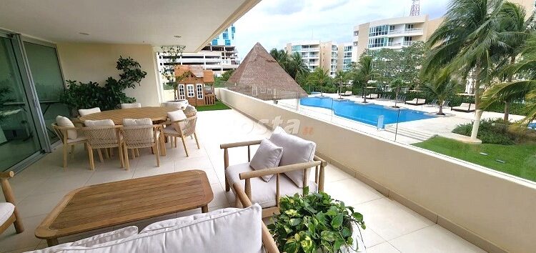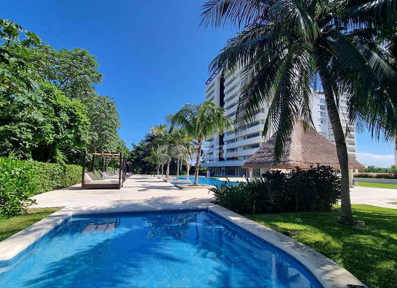 A very confy and expansive unit, professionally interiorized and equipped, with central air conditioner and an extraordinary terrace looking on to the gorgeous gardens and pòols. A large palapa furnished  for events, a childrens  mini football Field, semi-olimpyc swimming pool with jacuzzi and childrens wading pool.